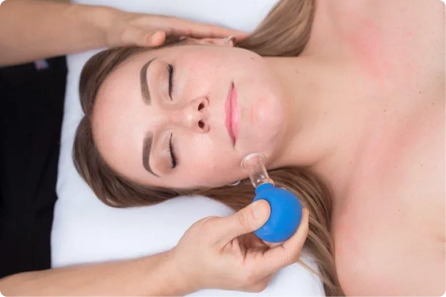 TMJ massage with facial/sinus cupping can alleviate pain caused by TMJD (Temporomandibular Joint Dysfunction) or sinus pain by manipulating the facial muscles while draining lymphatic fluid and reducing pressure.